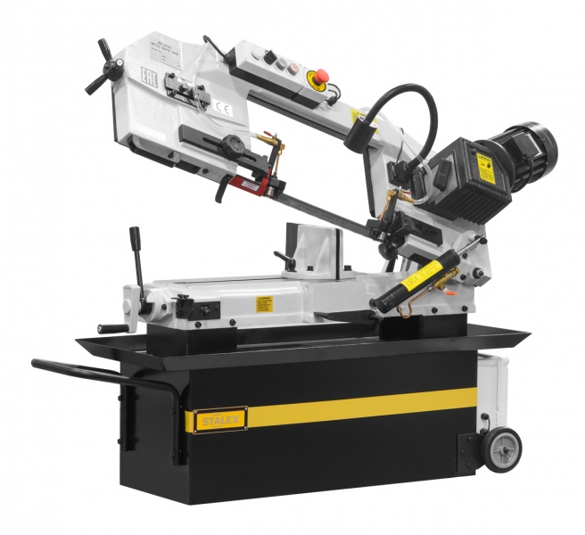 Станок Stalex BS-912G имеет поворот губок тисков, для пиления под углом необходимо изменять угол установки тисков, привод зубчатый. Зажим заготовки осуществляется тисками вручную, подача заготовки - также вручную. Мобильность станков позволяет использовать их на производстве непосредственно там, где это необходимо. Станки находят широкое применение в серийном и мелкосерийном производстве. Система СОЖ в стандартной комплектации.