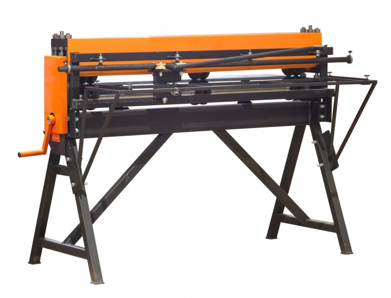 Станок поперечной резки металла. Протягивает листы рулонного металла через прорезиненные ролики. Механический отрезной нож. Макс. толщина протягивания и резки – 0,8мм (сталь) включительно.